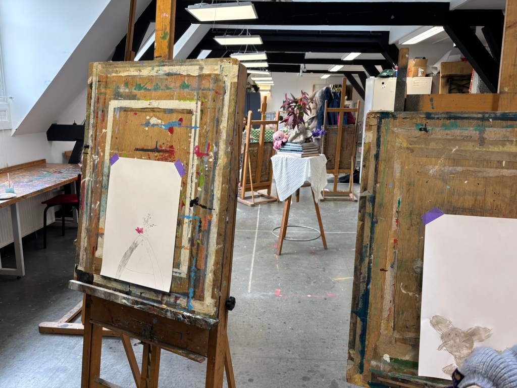 In het ruime atelier van het Koorenhuis gaan we als echte kunstenaars aan de slag. Hier mag je best een vlekje maken en kunnen we zelfs gebruik maken van echte schildersezels.